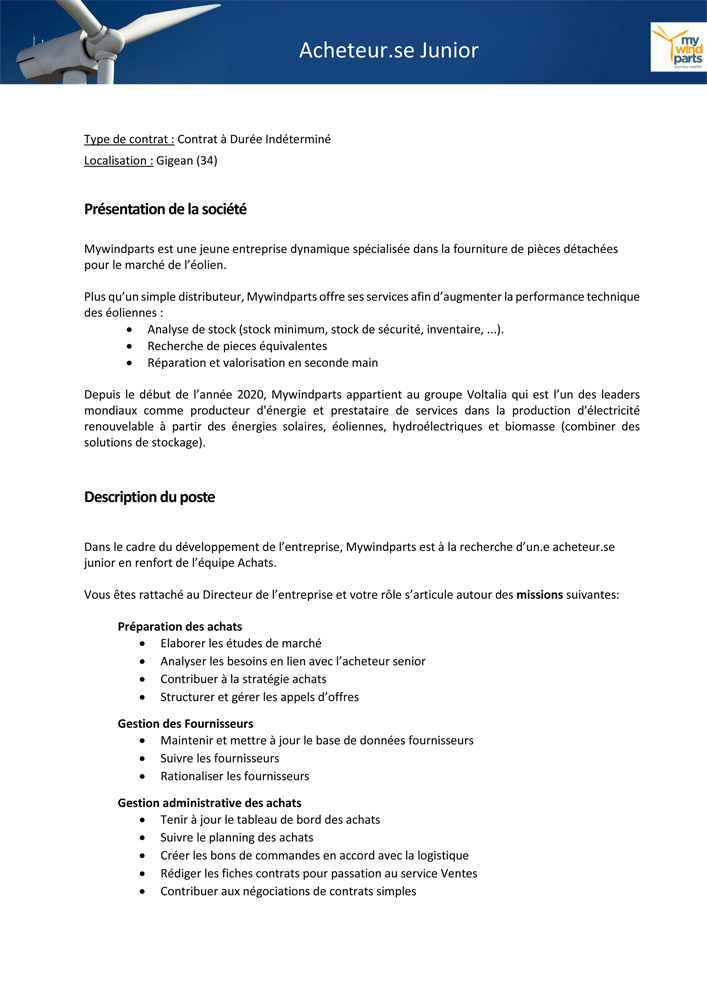 Consulter l'offre d'emploi Articles similairesDeublin : retrouvez leur gamme de joints tournants sur notre e-shop21 février 2025Notre gamme S.H.A : Disponible sur notre e-shop21 février 2025Mywindparts et Simatec : Un packaging à notre image21 février 2025S.H.A. : Second Hand Activity – Nacelle G808 octobre 2024Bienvenue à Sandra Quinde : Chargée de développement stagiaire8 octobre 2024Lancement de notre E-shop8 octobre 2024