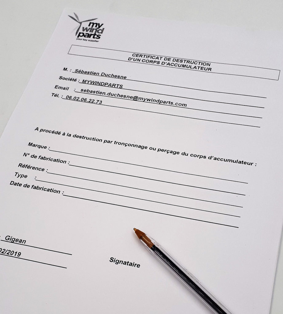 Mywindparts vend des accumulateurs neufs et gère le process de destruction des anciens jusqu’à l’acheminement au centre de collecte, pour valorisation.