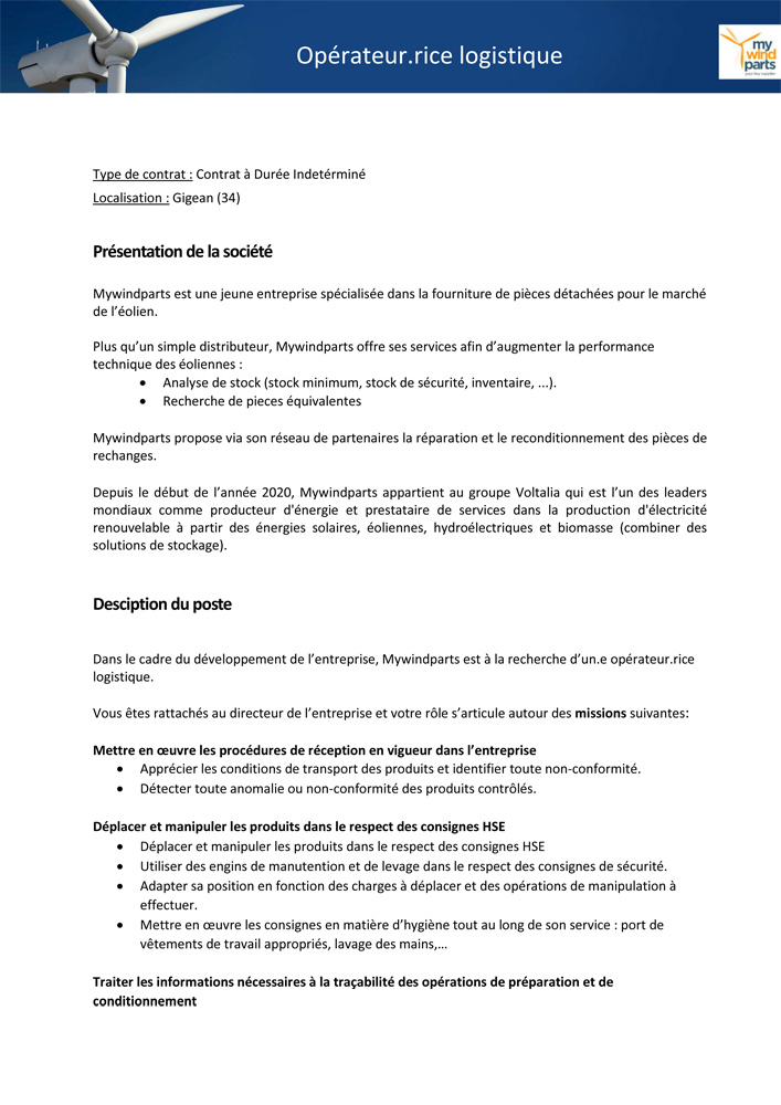 Consulter l'offre d'emploi Articles similairesDeublin : retrouvez leur gamme de joints tournants sur notre e-shop21 février 2025Notre gamme S.H.A : Disponible sur notre e-shop21 février 2025Mywindparts et Simatec : Un packaging à notre image21 février 2025S.H.A. : Second Hand Activity – Nacelle G808 octobre 2024Bienvenue à Sandra Quinde : Chargée de développement stagiaire8 octobre 2024Lancement de notre E-shop8 octobre 2024